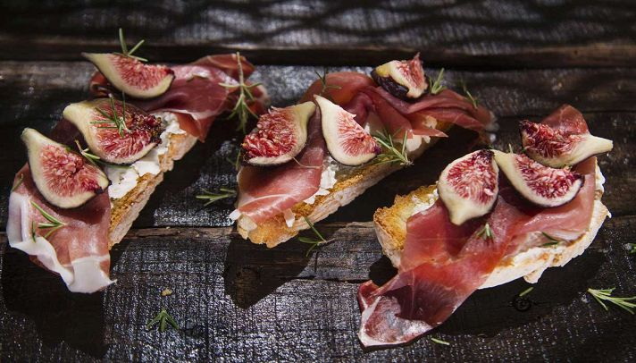 Брускетта с Пармской ветчиной и инжиром — универсальная закуска для фуршетного стола в Москве.
