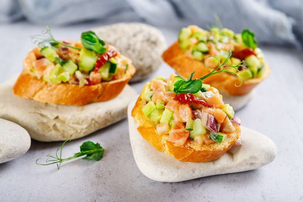 Брускетта с тар-таром из лосося и авокадо — универсальная морская закуска для фуршетного стола в Москве.