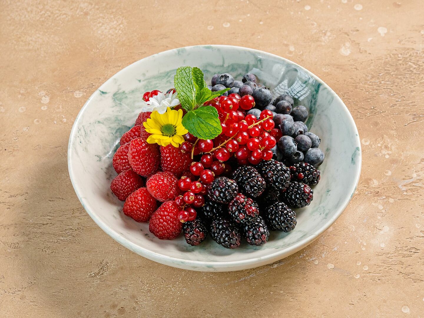 Ягоды подаются в эстетичном формате, что делает блюдо эффектным украшением сладкого стола. Натуральная сладость и лёгкая кислинка свежих ягод освежают вкус и прекрасно завершают банкетное меню.