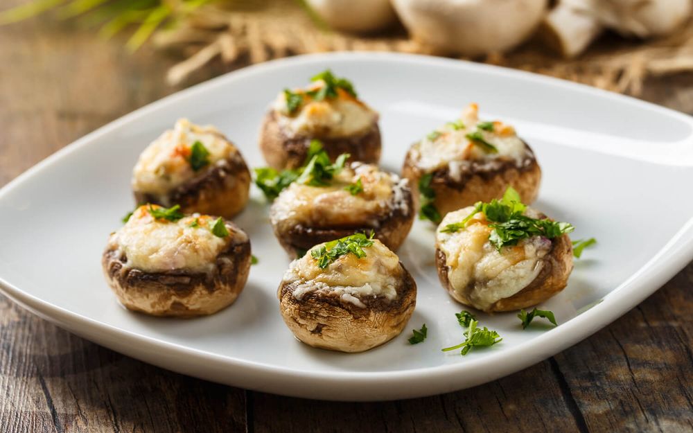 Шампиньоны запечённые «Сказка» — популярная закуска для банкетного стола и фуршета в Москве.