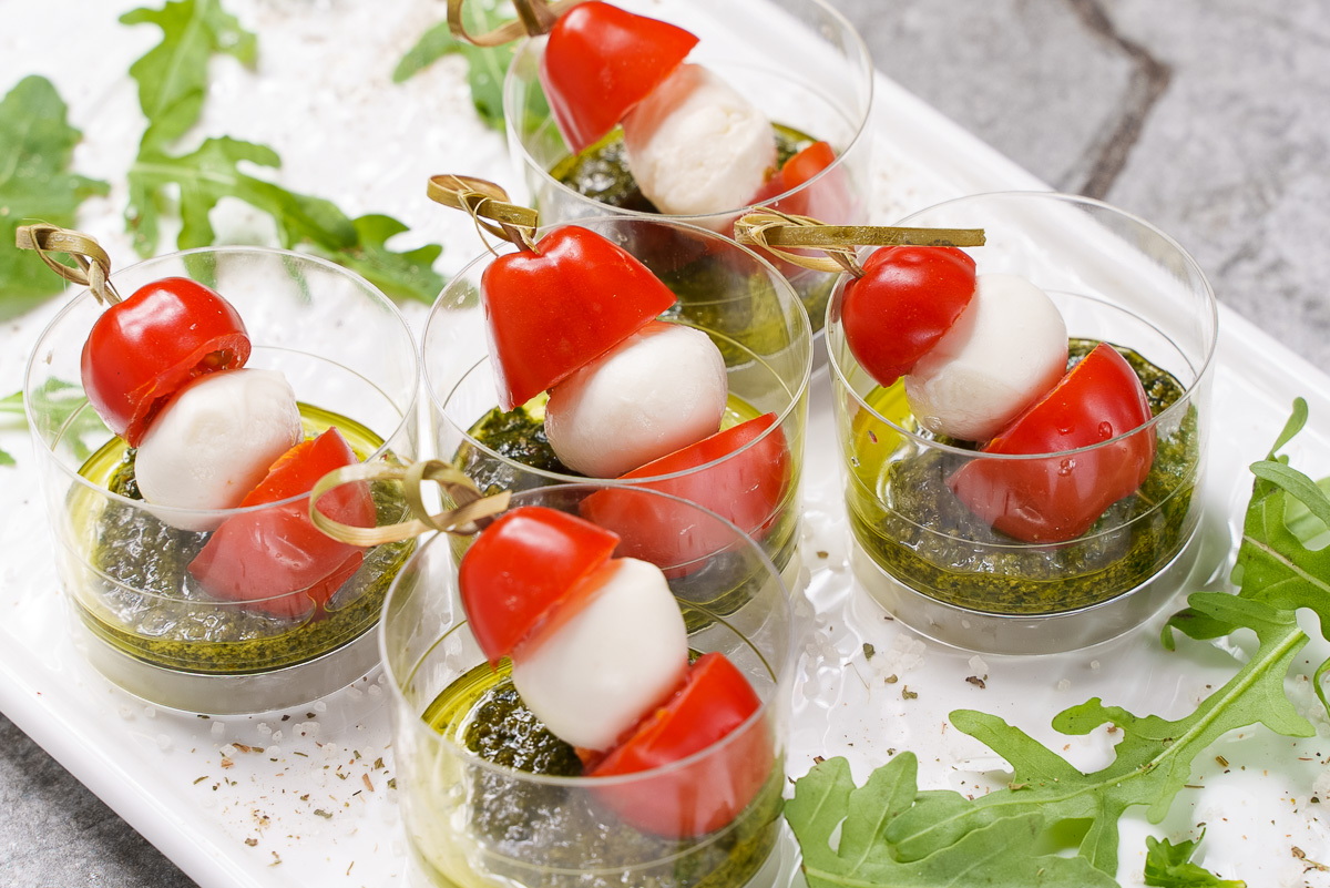 Канапе мини Капрезе — универсальная овощная закуска для фуршетного стола в Москве.