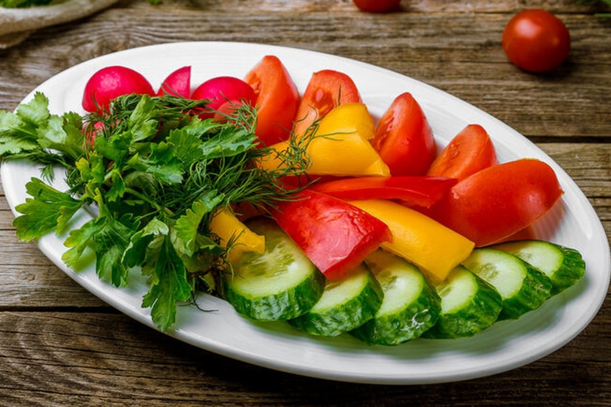 Ассорти Овощной букет — свежая и красочная овощная закуска для банкетов, корпоративных мероприятий и частных праздников в Москве. Комбинация помидоров, огурцов, сладкого перца и свежей зелени (укроп, кинза, базилик) создаёт гармоничный вкус и эффектную подачу на фуршетном столе.