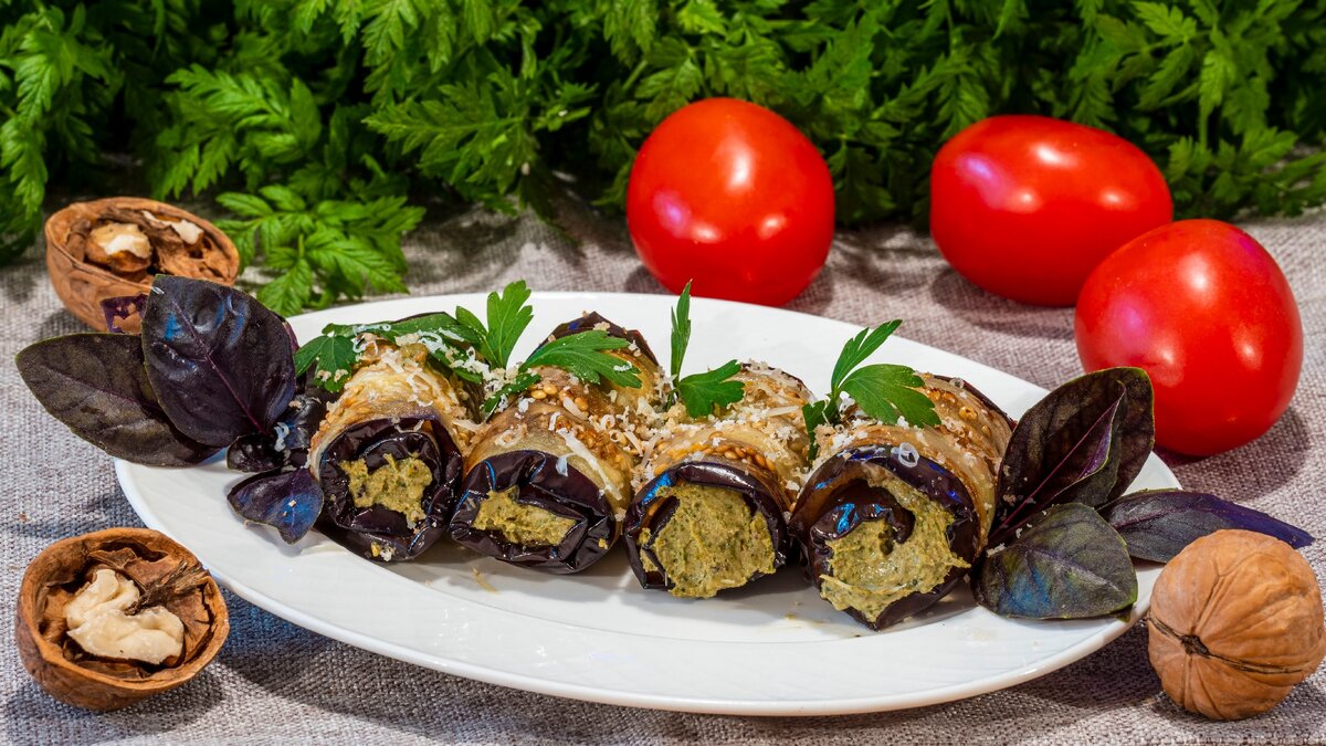 Рулетики из баклажанов с орехами — популярная закуска для фуршетного стола и банкетов в Москве.