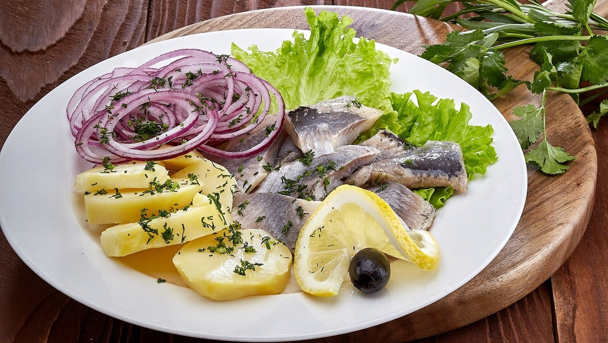 В составе — сельдь с/с, картофель отварной, лук маринованный. Закуска отличается сбалансированным вкусом, лёгкой солоноватостью рыбы и мягкой текстурой картофеля.