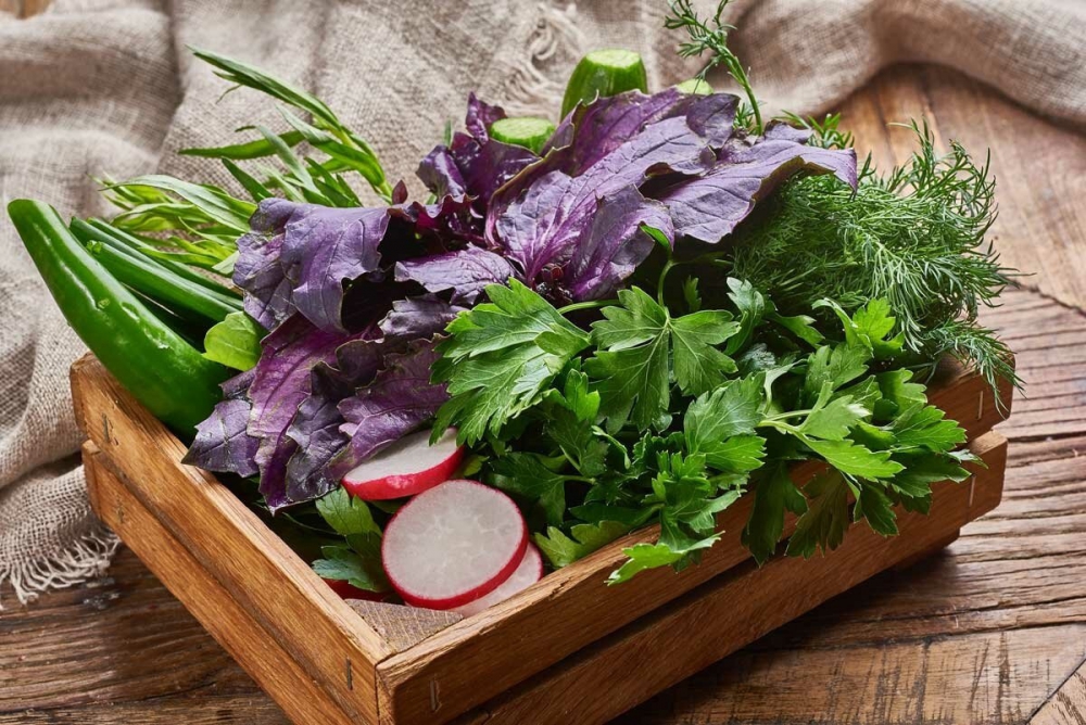 Ассорти из свежей зелени отлично дополняет мясные, рыбные и овощные блюда, создавая гармоничный баланс вкуса на фуршетном столе.
