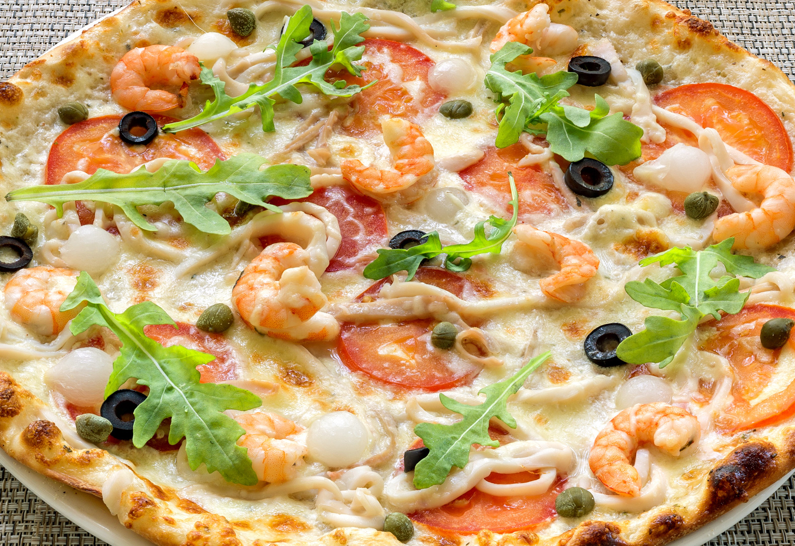 Пицца с красной рыбкой и тигровыми креветками — популярный выбор для кейтеринга и банкетного меню, сочетание нежного сыра, морепродуктов и свежих трав делает её любимым блюдом гостей.