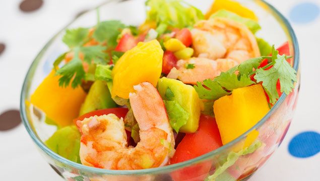 Салат Мини с тигровой креветкой и обжаренным манго — популярная закуска для фуршетного стола и банкетов в Москве.