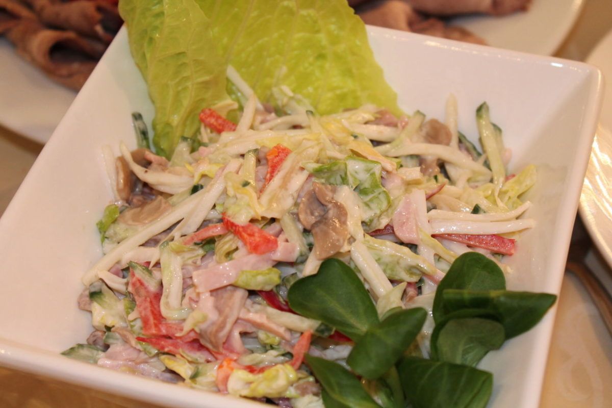 В составе — ростбиф, сладкий перец, томаты, огурцы, соус. Салат отличается свежестью ингредиентов, мягкой текстурой и эффектной порционной подачей.