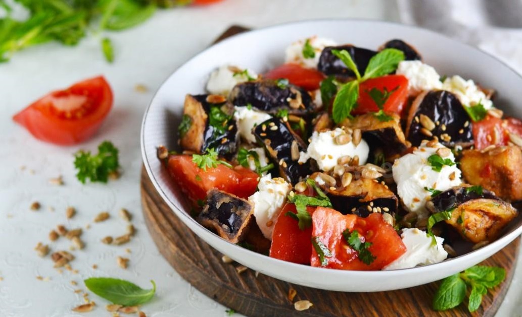 В составе — печёные баклажаны, свежие помидоры, грецкий орех, козий сыр, зелень, оливковое масло. Салат отличается свежестью ингредиентов, гармонией текстур и эффектной порционной подачей.
