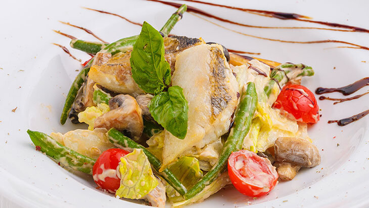 В составе — микс салатов, маслины, каперсы, вяленые томаты, соус песто, базилик, филе судака, лайм, крем бальзамический. Салат отличается свежестью ингредиентов, гармонией вкусов и эффектной порционной подачей.