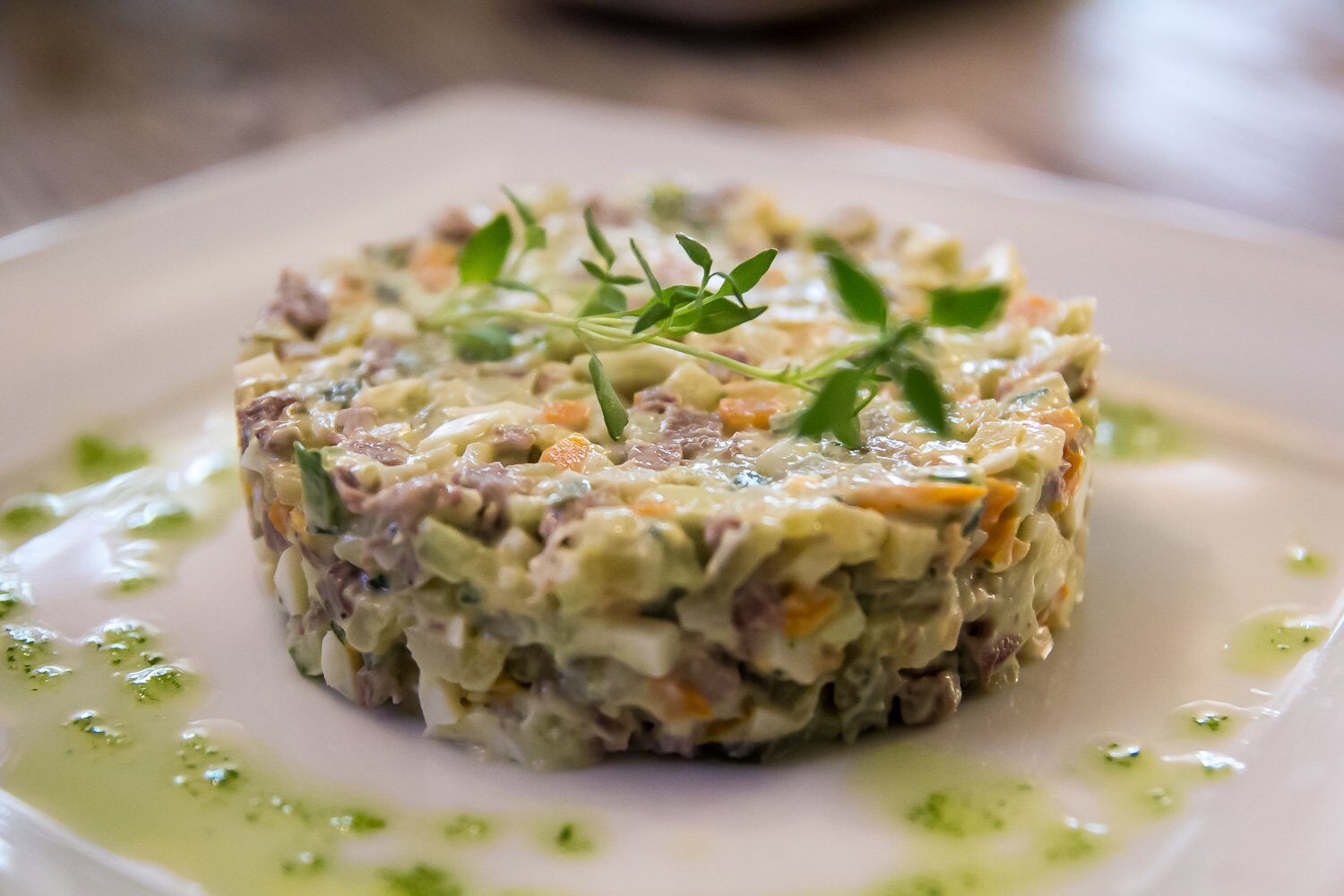 В составе — говядина, солёный огурец, картофель, морковь, зелёный горошек, яйцо куриное, соус провансаль. Салат отличается свежестью ингредиентов, мягкой текстурой и эффектной порционной подачей.