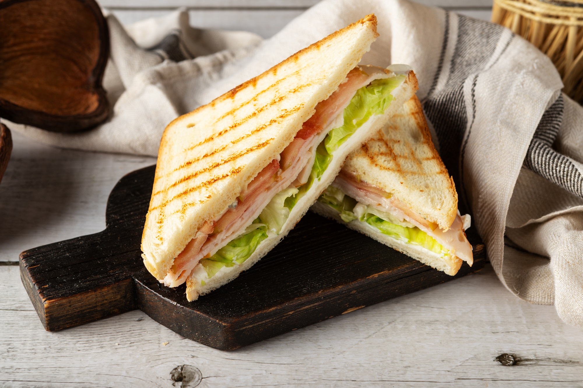 Сэндвич Классический — сытная и универсальная закуска для банкетов, корпоративных мероприятий и частных праздников в Москве. Мягкий тостовый хлеб сочетается с ароматной ветчиной, сыром, салатным листом, свежим огурцом и помидором, создавая классическое сочетание вкусов.